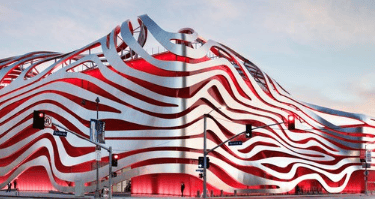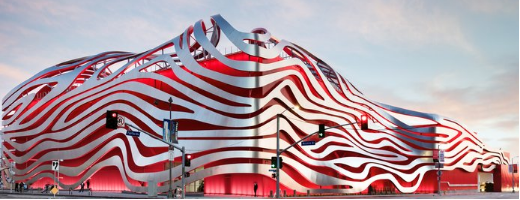 The exterior of the Petersen Automotive Museum is a sight to behold. The 3D effect of the roof is an architect's marvel. If you see the exterior when the sun hits the metal, it's quite a sight.
