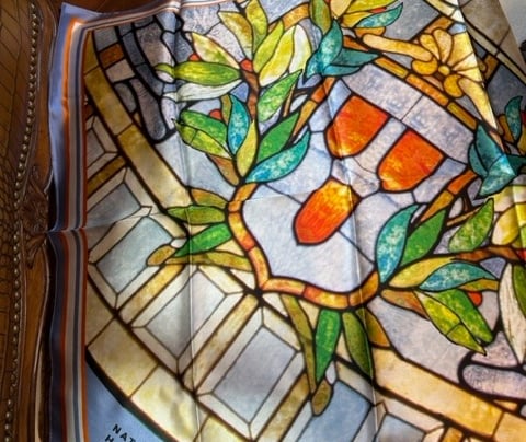 We visited the museum and took a variety of photos from different angles and then designed a square silk collector's item scarf, in satin silk to memorialize this historic masterpiece.