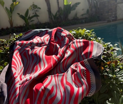 This beautiful, luxurious one of a kind long scarf mimics the depth of the roof in satin silk. The race track border fits in well with the theme of the museum - cars!